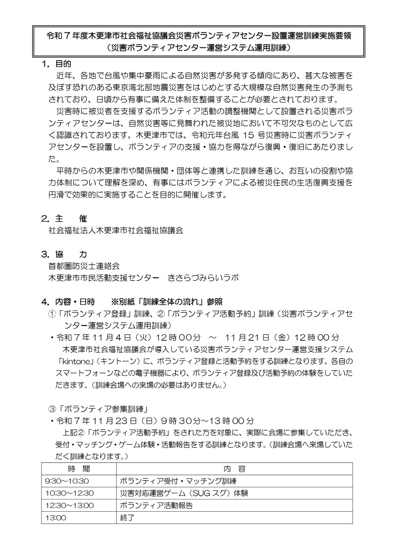 【訓練】 令和7年11月4日(火)~11月23日(日)災害ボランティアセンター設置運営訓練(災害ボランティアセンター運営支援システム運用訓練)を実施します。訓練への参加は、木更津市に在住の方に限らせていただきます。