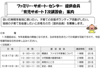 ファミリー・サポート・センターでは、子育ての手助けをしてくださる方(提供会員)へ、育児サポート1次講習会を開催します。