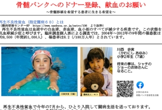 現在、市内小学校に在籍するお子さんが「再生不良性貧血」という難病で闘病生活を送っています。根治するには骨髄移植しかなく、ドナーが現れることを待っている状態です。木更津市社会福祉協議会としましても、ホームページ掲載やポスターを掲示し、周知することで支援していきたいと考えます。