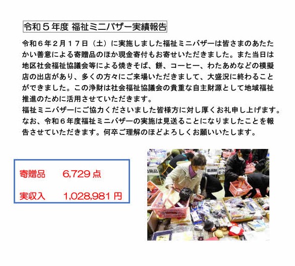 なお、令和6年度福祉ミニバザーの実施は見送ることになりましたことを報告させていただきます。何卒ご理解のほどよろしくお願いいたします。